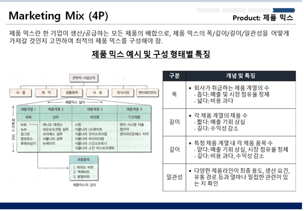 - 제품믹스는 기업이 제공하는 모든 개별제품들의 집합으로 넓이(폭), 길이, 깊이, 일관성으로 분석 가능 하다.